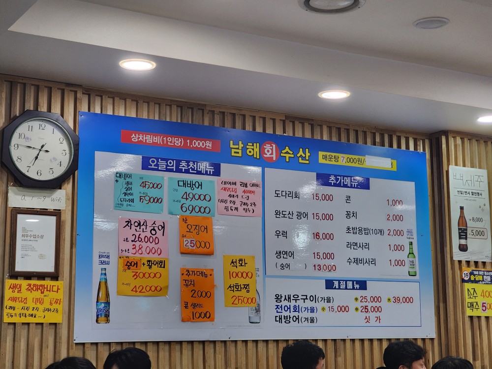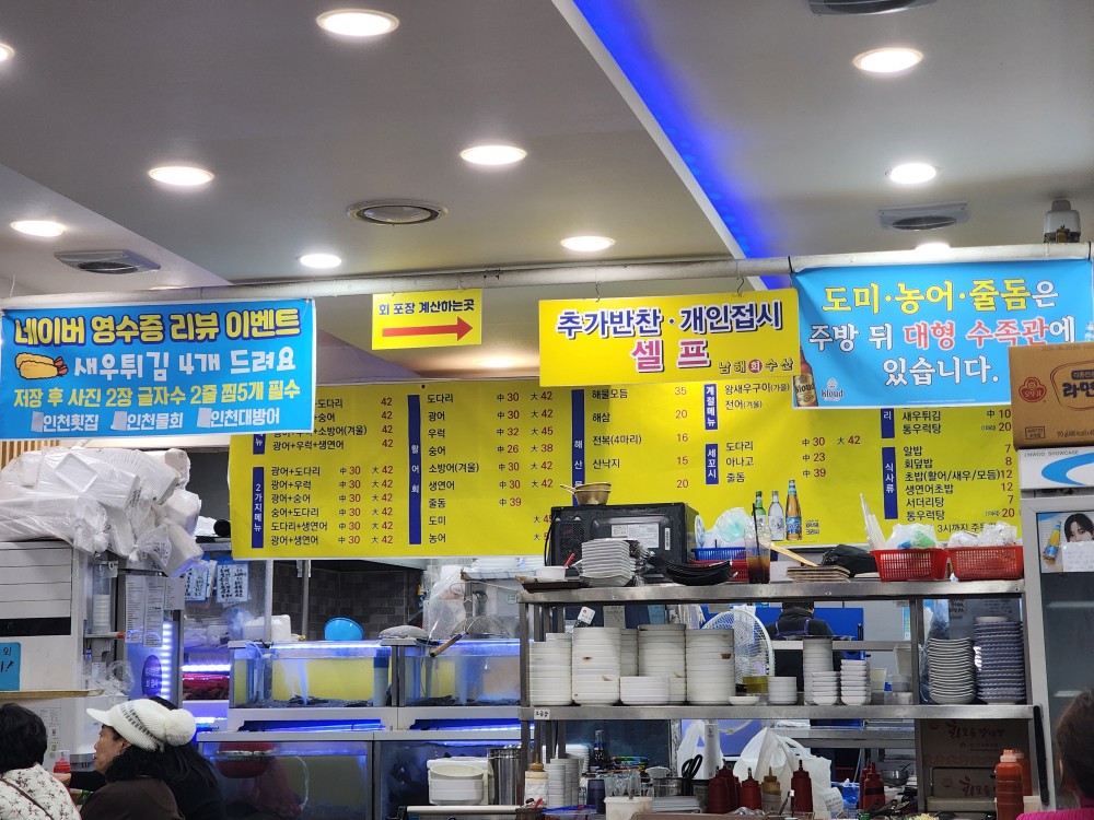 가게는 전형적인 동네 횟집 분위기로, 과하게 꾸미기보다는 실속과 편안함에 초점을 둔 느낌이었어요. 테이블 간 간격이 너무 좁지 않아 대화하기 좋았고, 단체 손님과 소규모 손님이 섞여 있어 비교적 활기찬 분위기였죠.